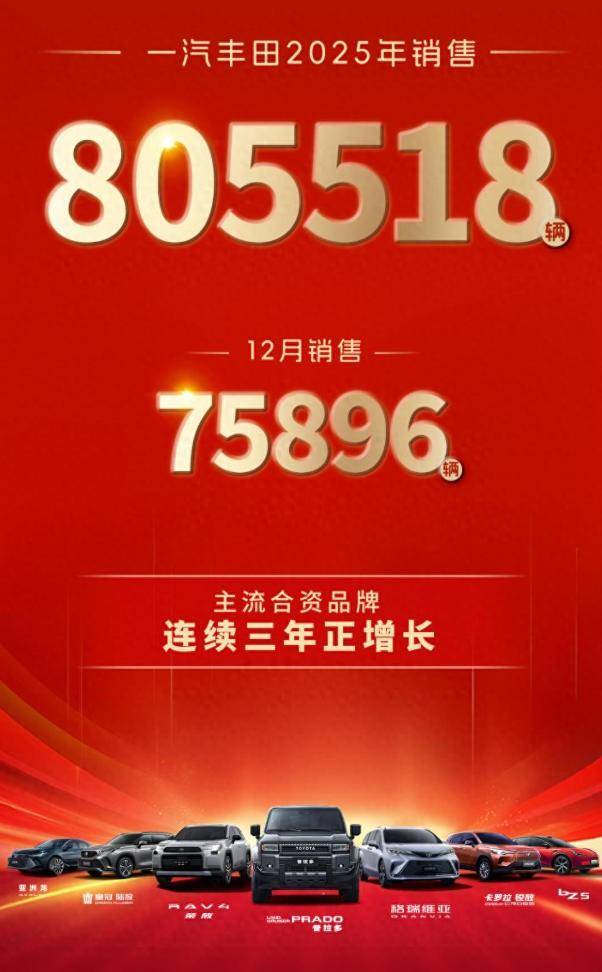 但当我们盘点销量时,却发现一汽丰田交出了一份亮眼的答卷,数据显示,2025年一汽丰田全年销售新车805518辆,成为连续三年实现正增长的主流合资品牌,如此表现,也不禁让人要问,一汽丰田的2025到底做了什么?